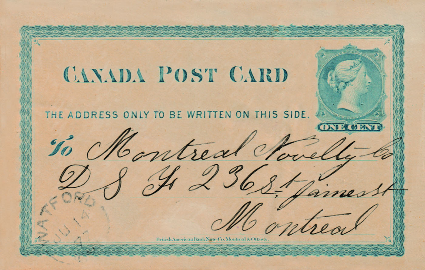 If one were to use the term “picture postcard” today it would sound redundant as it is understood that postcards normally have an image of some kind. This wasn’t the case from the get-go however. The first official “Canada Post Card,” issued by the Post Office in 1871, had an imprinted stamp and some ornamental framing but no other images (see Figure 1). It wasn’t until the Post Office relinquished its monopoly on postcard production and sales in 1895 that competition in the private sector eventually gave us the picture postcard that was so popular during the hobby’s golden age (1900–1914).