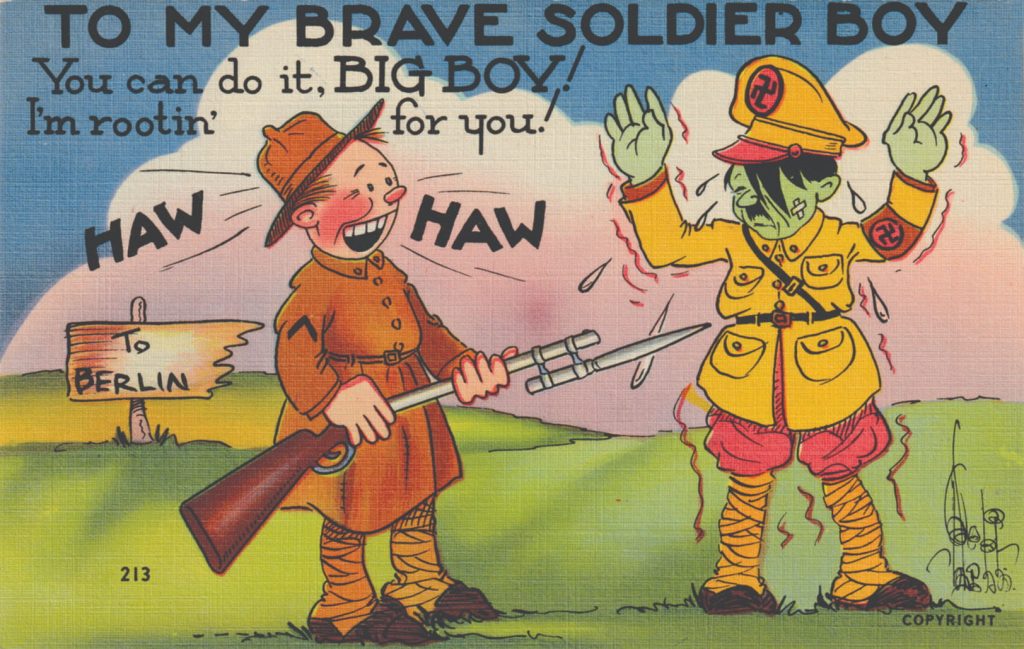 There were two major linen postcard makers in Massachusetts that provided Curt Teich with some serious competition – Tichnor Bros. Inc. of Boston, and Colourpicture Publishers Inc. of Cambridge. Like Teich, these firms used a five-colour printing process and a textured paper the same as or similar to that used by Teich. And also, like Teich, Tichnor Bros. and Colourpicture Publishers produced some very collectible anti-Hitler and anti-Japanese propaganda postcards during the Second World War (1939–1945). Interestingly, although both the Japanese leadership and the Japanese people were fair game on these cards, American propaganda against Germany was aimed almost exclusively at Hitler (see Figure 2) and not the German people. The large German population in the US at the time may have been a factor here.